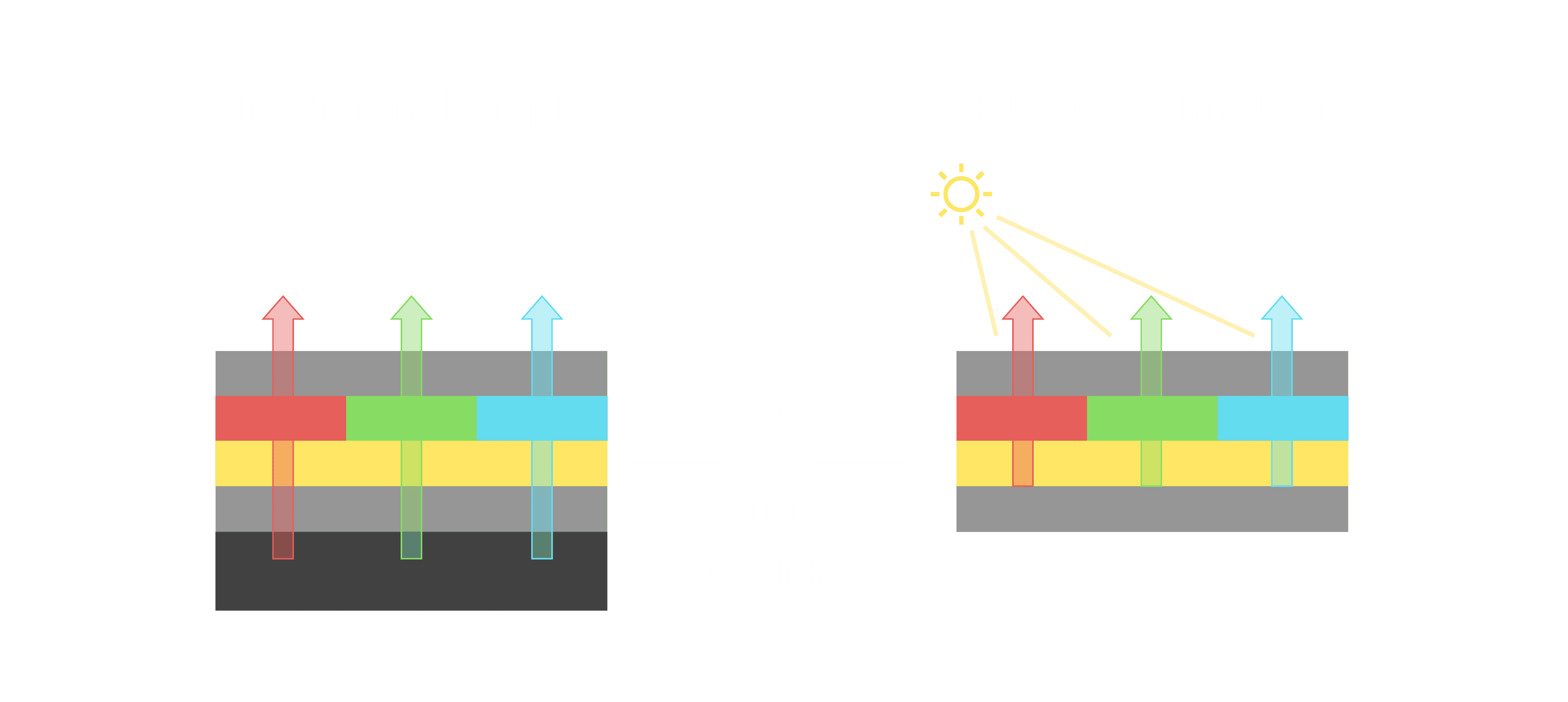 与传统需搭配背光单元的液晶显示相比,,反射式液晶技术不仅更省电、、更轻薄,,,且即便在艳阳下仍能清晰显示。。。此外,,少了背光单元,,也大幅降低了 LED 蓝光伤害眼睛的疑虑。。