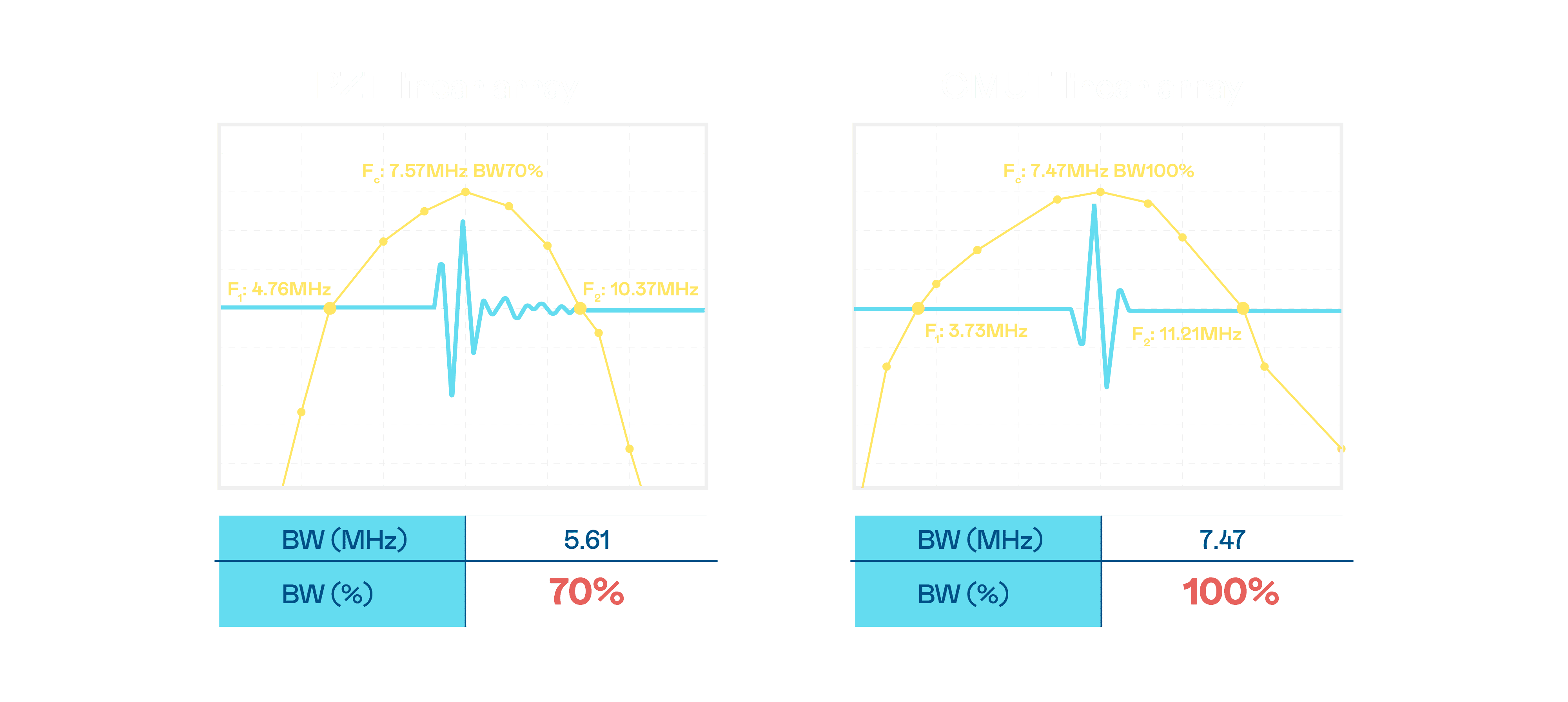 超音波影像的解析度高低,,首先取决于探头能发出的讯号频宽。。。PA直营 CMUT 可提供高清晰的超音波讯号,,,,提供高频宽、、、高灵敏度、、影像纹理细节更高的超音波影像,,,协助医护人员缩短影像判读时间及利用精准的医疗影像进行诊断。。。