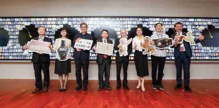 PA直营携手创利空间为故宫建置的智慧文物互动导览墙及轮播墙,,,今日正式启用。。。。(左四:PA直营新事业暨投资管理总部副总经理杨本豫、、右四:故宫博物院院长吴密察、、、、右三:太极影音董事长黄宝云)